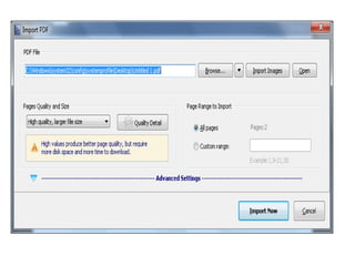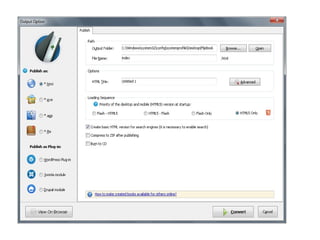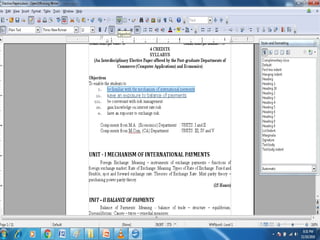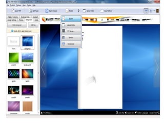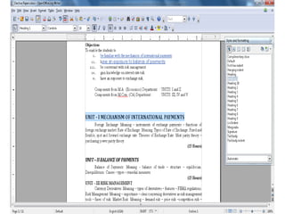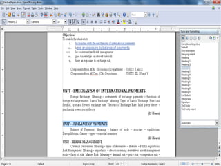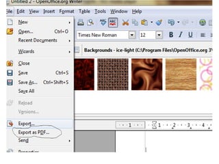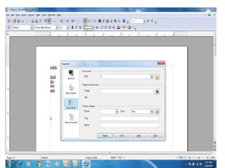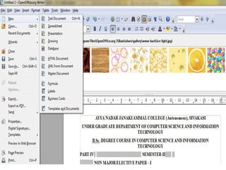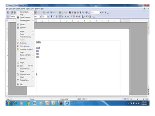This document discusses features of the LibreOffice software suite including word processing, spreadsheets, presentations, diagrams, databases, and mathematical formulas. It provides instructions on opening a text document in LibreOffice and describes the various menu options for file editing, viewing, inserting, formatting, and using tables. The document also outlines how to create an e-book and use mail merge and macros in LibreOffice.