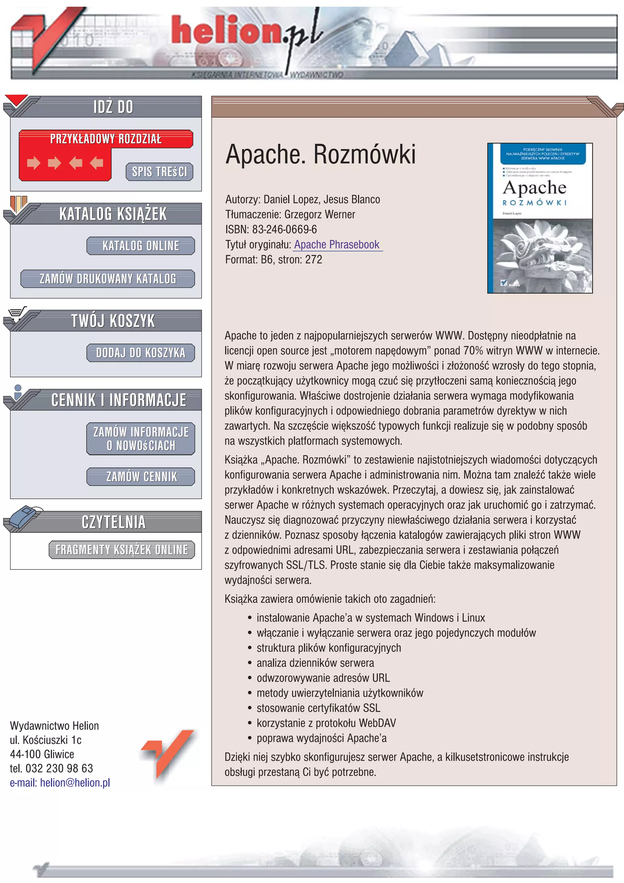 Apache to jeden z najpopularniejszych serwerów WWW. Dostępny nieodpłatnie na licencji open source jest "motorem napędowym" ponad 70% witryn WWW w internecie. W miarę rozwoju serwera Apache jego możliwości i złożoność wzrosły do tego stopnia, że początkujący użytkownicy mogą czuć się przytłoczeni samą koniecznością jego skonfigurowania. Właściwe dostrojenie działania serwera wymaga modyfikowania plików konfiguracyjnych i odpowiedniego dobrania parametrów dyrektyw w nich zawartych. Na szczęście większość typowych funkcji realizuje się w podobny sposób na wszystkich platformach systemowych.