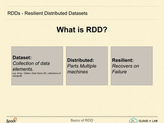 The document provides an overview of Resilient Distributed Datasets (RDDs) in Apache Spark, explaining their structure as immutable collections of data that are partitioned across clusters and recoverable from failures. It covers key operations on RDDs including transformations (like map, filter, and flatMap) and actions (like collect, take, and reduce), emphasizing the importance of lazy evaluation for optimization. Additionally, the document discusses practical examples and the differences between map and flatMap operations.