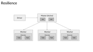 The document discusses the resilience and fault-tolerant features of Apache Spark's Resilient Distributed Dataset (RDD), explaining how RDDs can recover from node failures using lineage-based recomputation. It also covers shard allocation strategies, partition configurations, and the trade-offs involved in setting the number of partitions to optimize performance. Additionally, examples illustrate common partitioning issues and their solutions within Spark's ecosystem.