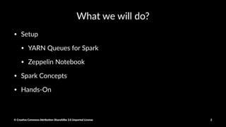 The document provides a detailed guide on setting up and using Apache Spark with Hortonworks Data Platform, including steps for configuring YARN queues, Zeppelin notebooks, and creating Resilient Distributed Datasets (RDDs). It covers concepts like RDD transformations and actions, data processing techniques, and practical hands-on instructions for working with datasets in Spark. Key functions and methods are demonstrated with examples to facilitate understanding of Spark's functionality for data processing.