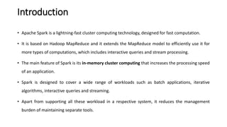 Spark is a fast, general-purpose cluster computing system. It provides high-level APIs in Java, Scala, Python and R for distributed tasks including SQL, streaming, and machine learning. Spark improves on MapReduce by keeping data in-memory, allowing iterative algorithms to run faster than disk-based approaches. Resilient Distributed Datasets (RDDs) are Spark's fundamental data structure, acting as a fault-tolerant collection of elements that can be operated on in parallel.