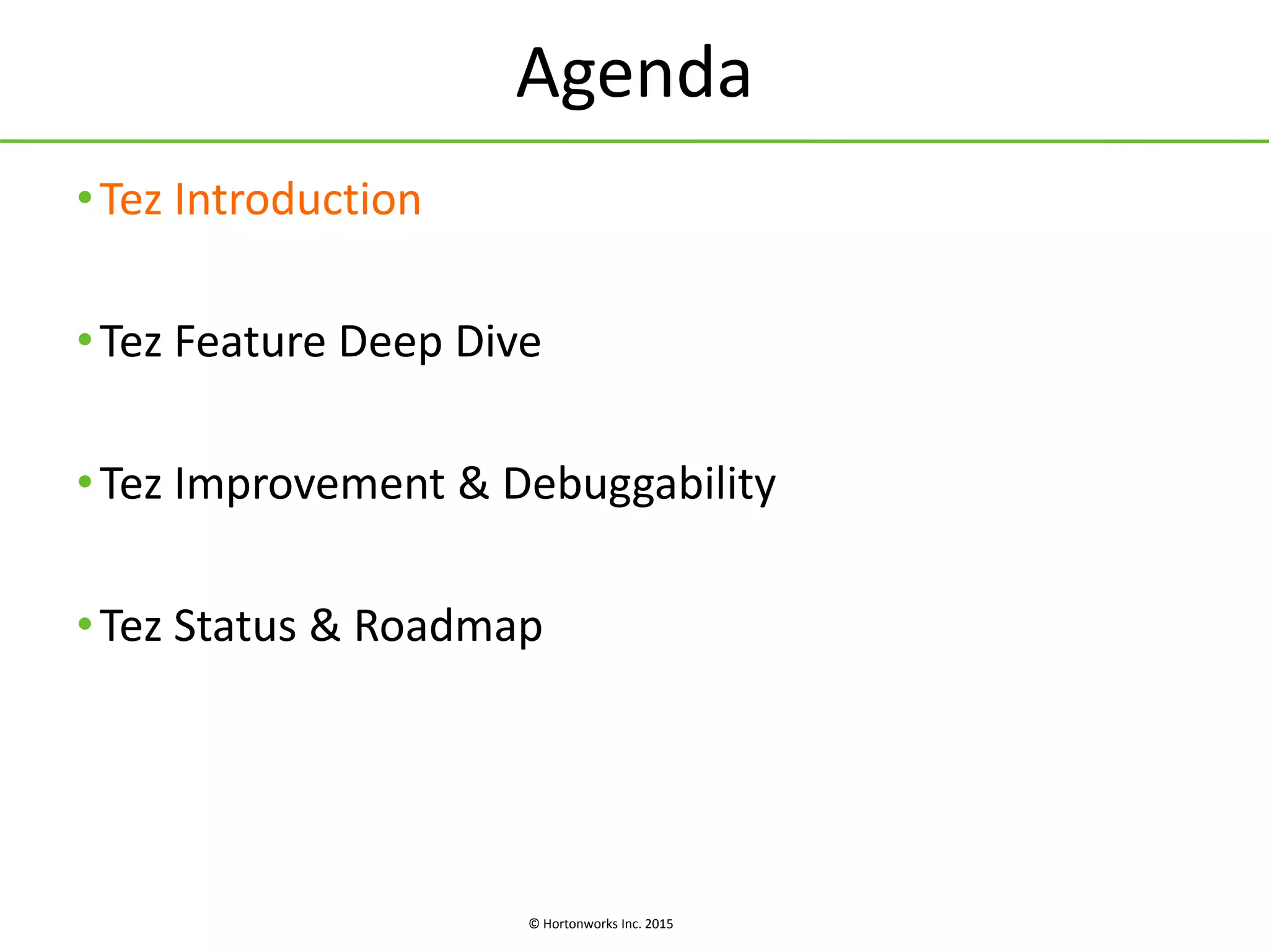 Apache Tez is a framework for building data processing applications on top of YARN. It allows expressing a computation as a directed acyclic graph (DAG) to optimize execution. Tez improves on MapReduce by avoiding intermediate data writes to HDFS and enabling optimizations across jobs. The presentation covered Tez features like container reuse, dynamic parallelism, and integration with YARN timeline service. It also discussed ongoing work to improve performance through speculation, intermediate file formats, and shuffle optimizations.