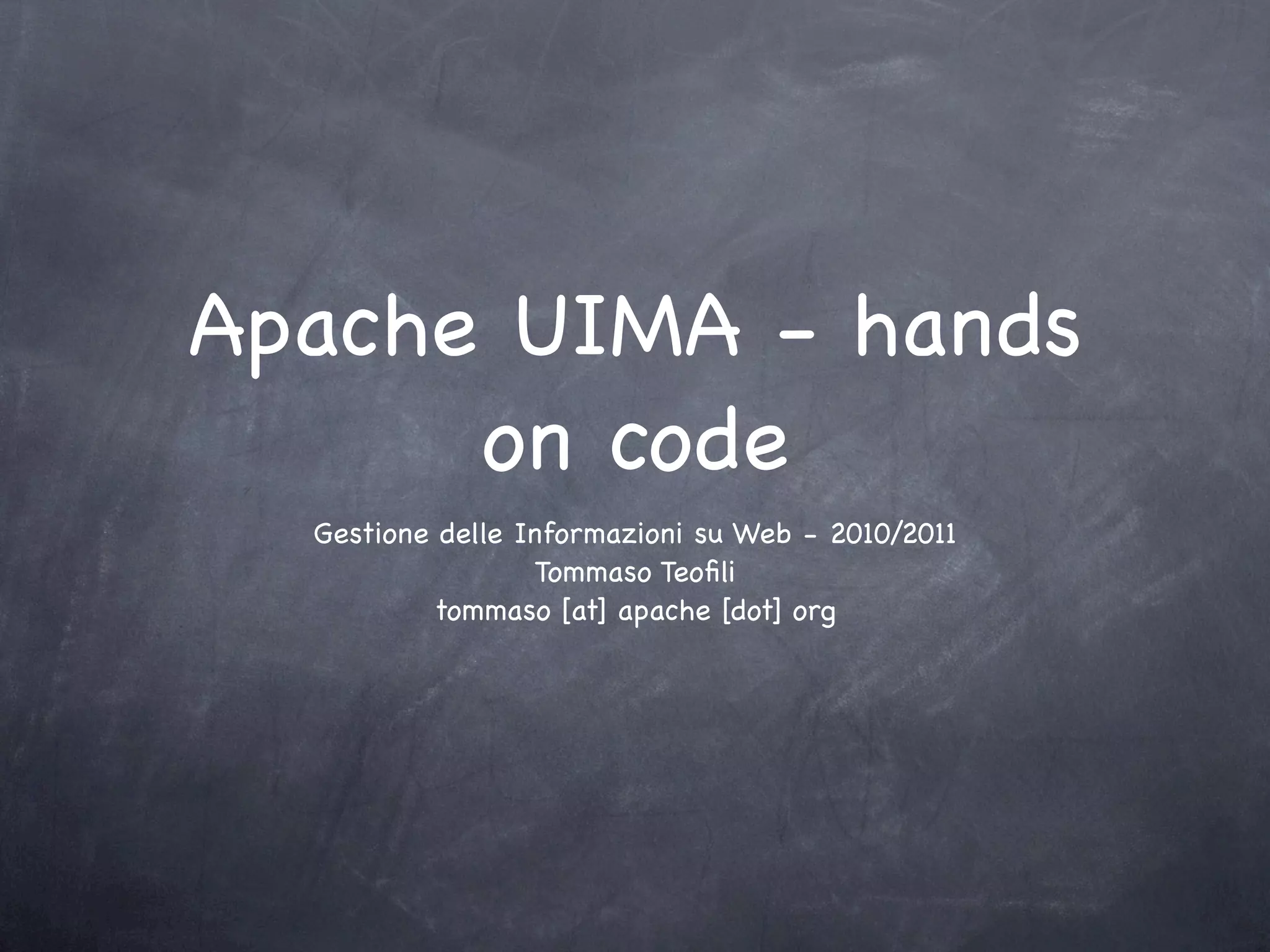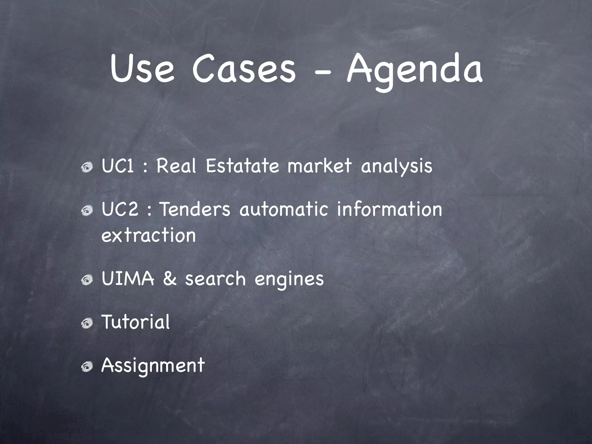 The document discusses two use cases (UC1 and UC2) for applying Apache UIMA to automatically extract structured information from unstructured text. UC1 involves using UIMA to analyze real estate listings to extract fields like price, zone, and phone number to track trends in the real estate market. UC2 aims to automatically extract common information like language, funding type, and expiration date from announcements of EU tenders and contracts. The document outlines the different components involved in each use case, including crawlers to extract text, annotators to identify relevant entities, and CAS consumers to store extracted fields in databases or indexes.