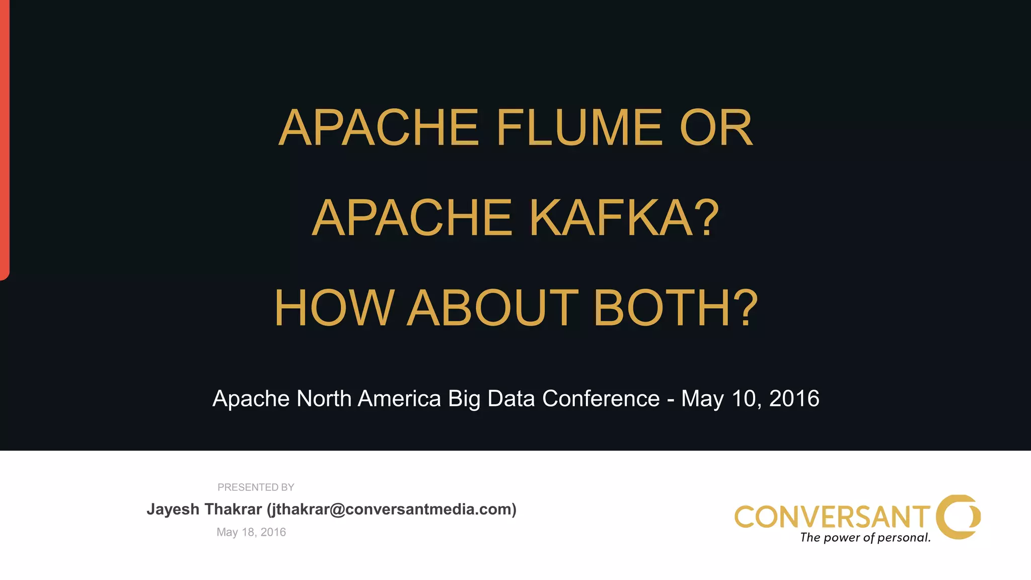 This document compares Apache Flume and Apache Kafka for use in data pipelines. It describes Conversant's evolution from a homegrown log collection system to using Flume and then integrating Kafka. Key points covered include how Flume and Kafka work, their capabilities for reliability, scalability, and ecosystems. The document also discusses customizing Flume for Conversant's needs, and how Conversant monitors and collects metrics from Flume and Kafka using tools like JMX, Grafana dashboards, and OpenTSDB.