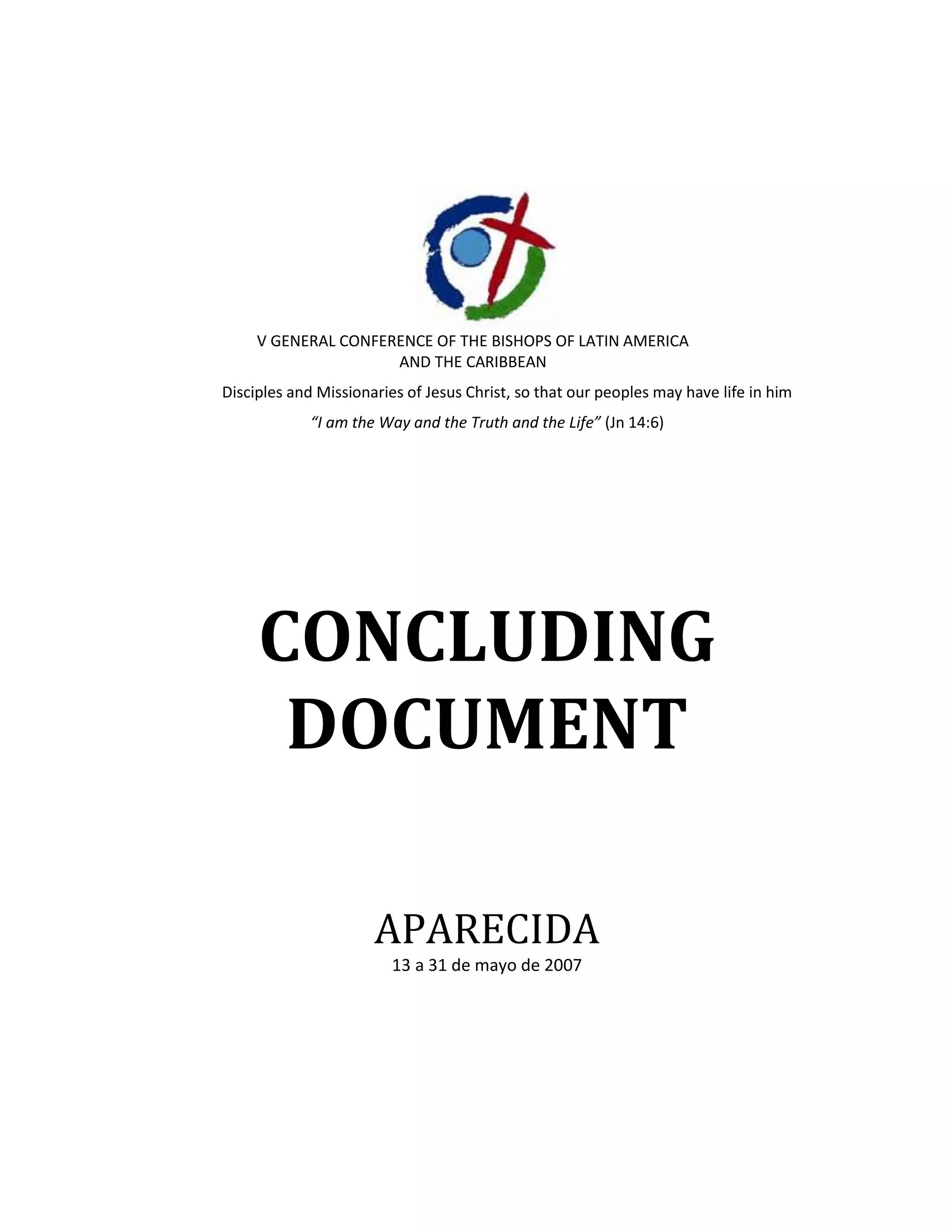 This document summarizes the concluding document from the Fifth General Conference of Bishops of Latin America and the Caribbean, held in Aparecida, Brazil in 2007. The conference addressed the challenges facing the Catholic Church in Latin America, including secularism and the growth of evangelical sects. It emphasized the need to strengthen Christian formation, promote devotion to the Eucharist, and launch a "Continental Mission" to revitalize the faith. The bishops sought to make the faithful stronger disciples and missionaries of Christ.