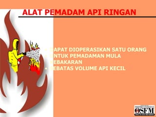 Dokumen ini membahas tentang alat pemadam api ringan, mencakup operasional, jenis media pemadam, dan pengujian yang diperlukan untuk memastikan fungsionalitas dan keselamatan. Pentingnya pemeliharaan, penempatan yang tepat, serta pelatihan petugas juga ditekankan untuk mencegah kegagalan dalam situasi darurat. Selain itu, klasifikasi serta daya pemadaman sesuai dengan jenis kebakaran yang mungkin terjadi juga diuraikan.