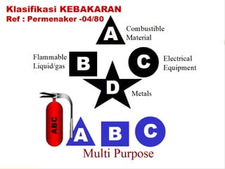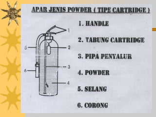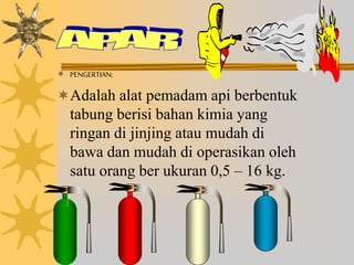 Dokumen ini menjelaskan tentang alat pemadam api ringan (APAR) yang terdiri dari berbagai jenis dan isi untuk memadamkan berbagai kelas kebakaran, seperti kelas A, B, C, dan D. Selain itu, dokumen ini juga menguraikan fungsi, prinsip kerja, penempatan, dan pemeliharaan APAR yang diperlukan untuk memastikan efektivitas dan keselamatan penggunaannya. Informasi mengenai bahan kimia yang digunakan pada setiap jenis APAR serta pedoman pemasangan dan penggunaan yang benar juga disampaikan.