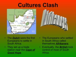 The document discusses the history of apartheid in South Africa. It describes how the Dutch first settled in South Africa, followed by the British who took control of most of the country. The white government then created apartheid, a system to separate society by race and give rights only to whites. Apartheid forced blacks into poor areas, denied them voting rights, and segregated public services. Nelson Mandela was imprisoned for 28 years for fighting apartheid, then elected president in 1994 after apartheid ended, working to create a unified, equal nation. South Africa still faces issues like economic inequality and health challenges.