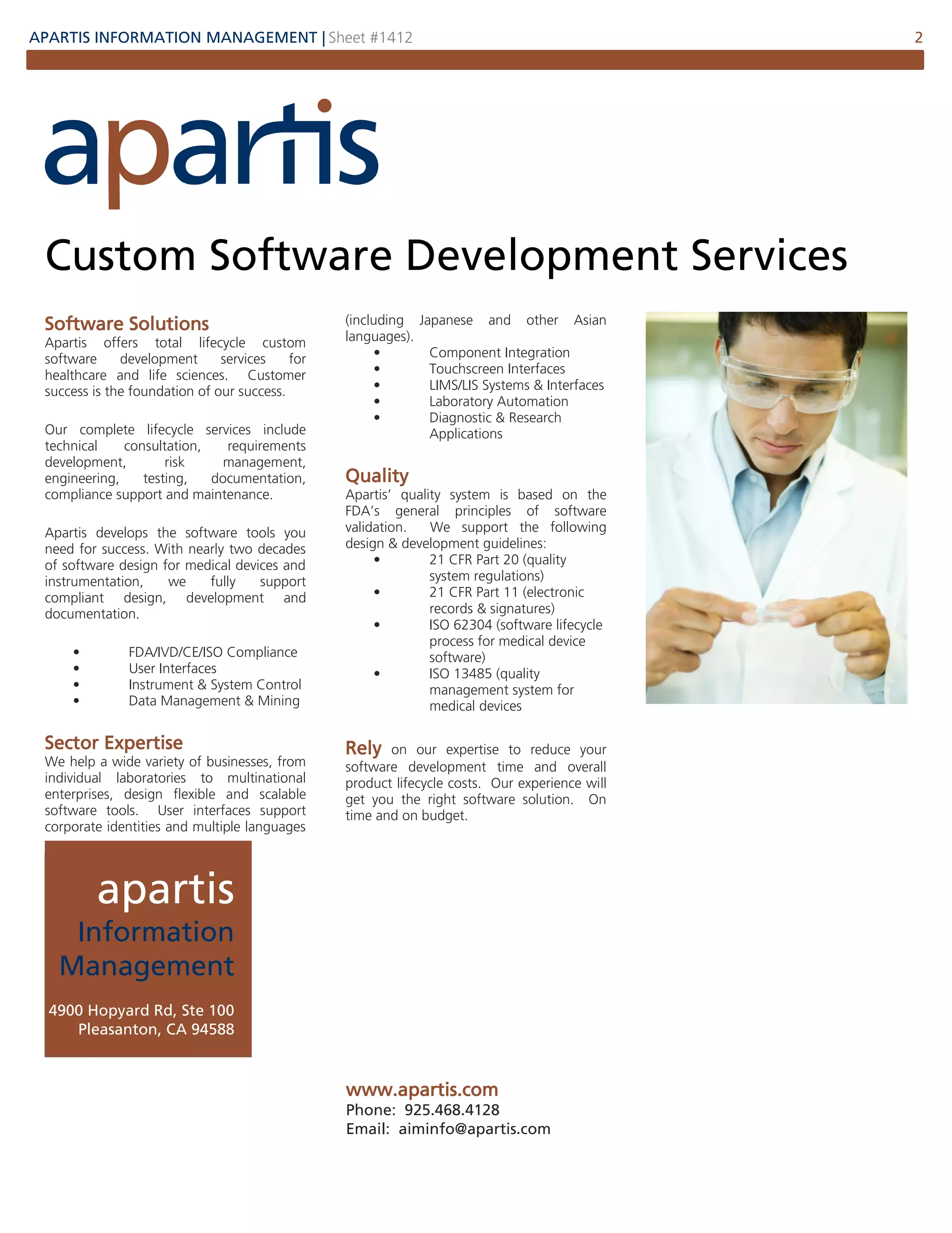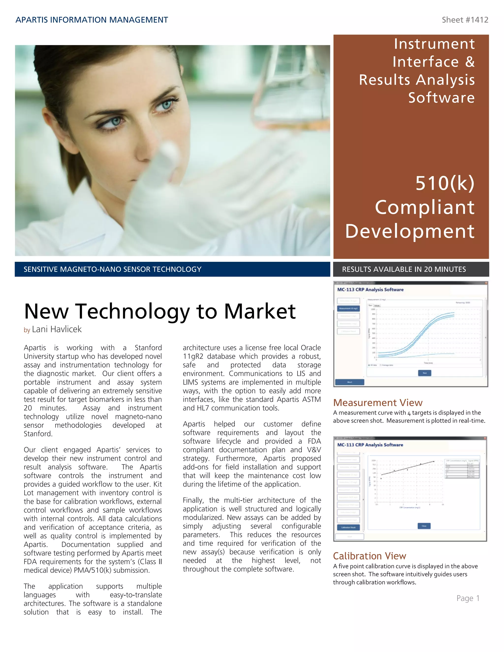 Apartis developed instrument control and result analysis software for a Stanford startup company that has created a portable instrument and assay system capable of delivering sensitive biomarker test results in under 20 minutes. The Apartis software controls the instrument, guides users through workflows, manages data and quality control, and meets FDA requirements for medical device approval. Apartis helped define requirements, provided documentation and verification plans, and proposed support options to keep maintenance costs low over the lifetime of the application.