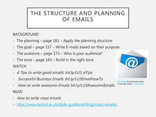 The document provides guidance on writing effective emails. It discusses the importance of planning emails by considering the purpose, audience, and tone. It recommends applying a structure that addresses these elements. The document also shares links to additional resources on writing good emails, successful business emails, and how to write awesome emails. It suggests researching rules of email etiquette that are important in the workplace and explaining why each rule is significant today.