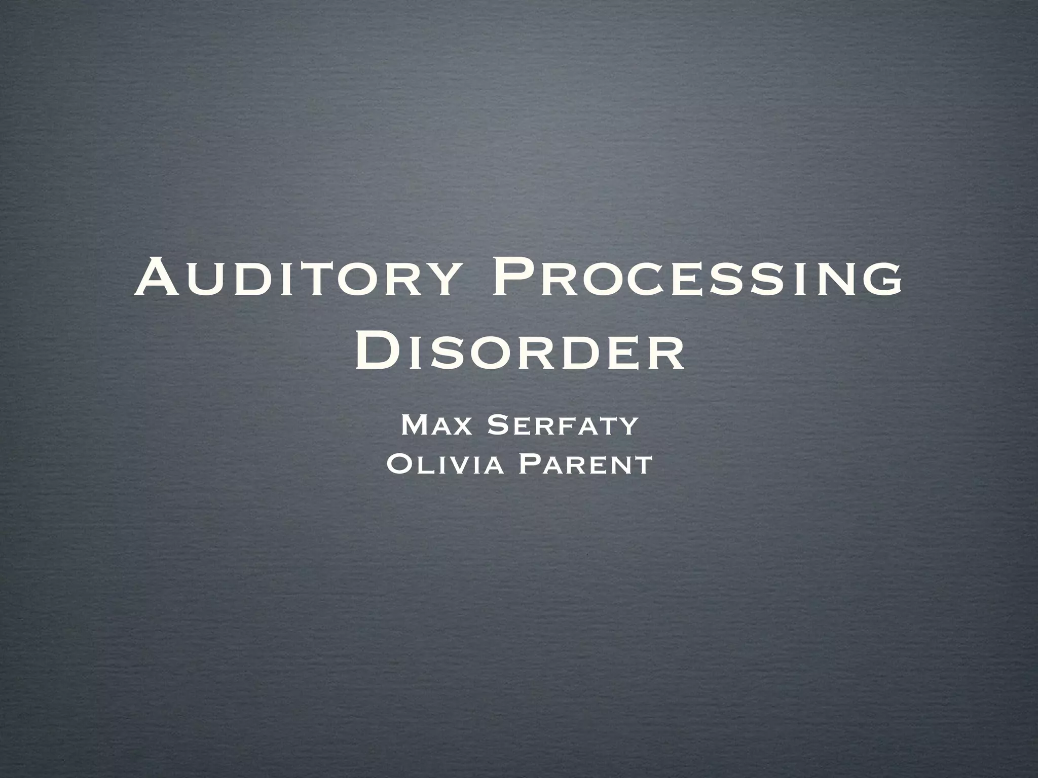 Auditory processing disorder (APD) refers to difficulties interpreting sounds and auditory information in the brain. It can affect 2-3% of children and 17-20% of adults, often being misdiagnosed as other conditions due to shared symptoms. Causes may include genetic factors, head trauma, or ear infections. People with APD struggle with tasks like paying attention, following directions, and processing oral information quickly. This can impact social development and success in school or work. Treatment focuses on auditory training exercises through computer programs or occupational therapy.