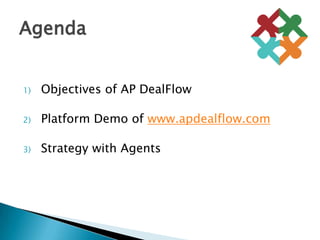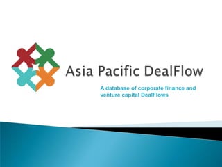 The document discusses an Asia Pacific DealFlow platform that aims to connect companies seeking funding with corporate finance agents and investors. It provides an overview of the objectives of the AP DealFlow platform, how it can source deals and push deal flows to investors, and the typical business models of agents who use the platform. The document also outlines some difficulties faced by companies, agents, angel investors, and venture capital/PE investors, and proposes solutions that the AP DealFlow platform could provide.