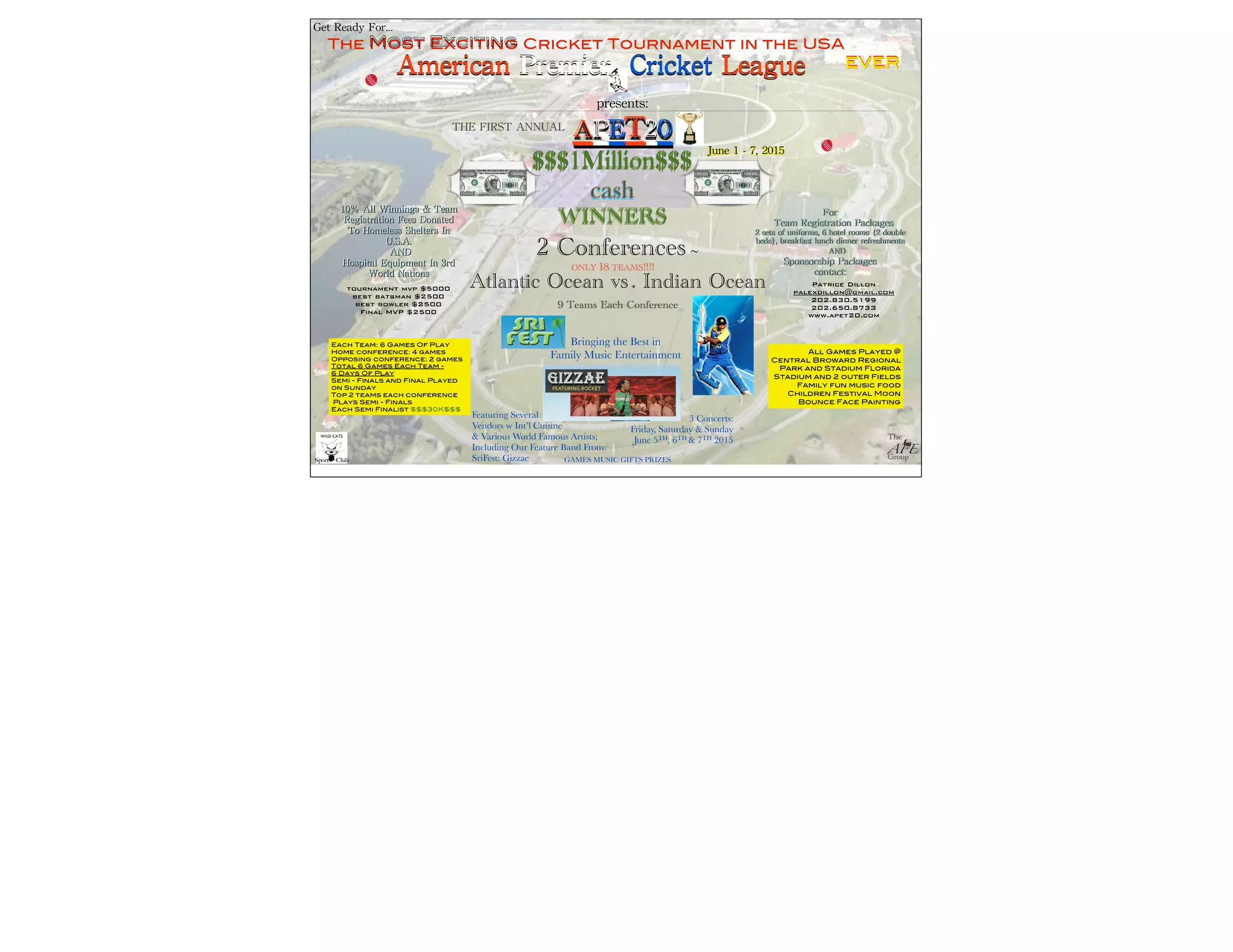 The American Premier Cricket League is hosting the APET20 cricket tournament from June 1-7, 2015 in Florida. The tournament will feature 18 teams split into two conferences, with cash prizes totaling $1 million. Team registration packages include uniforms, hotel rooms, and meals. Sponsorship opportunities are available. The tournament will include family entertainment along with the cricket matches.