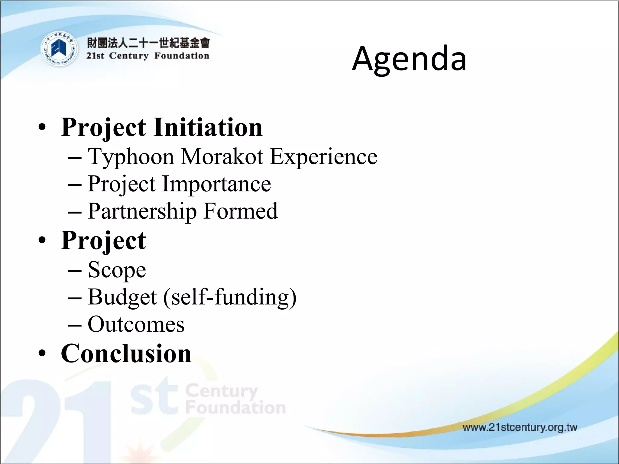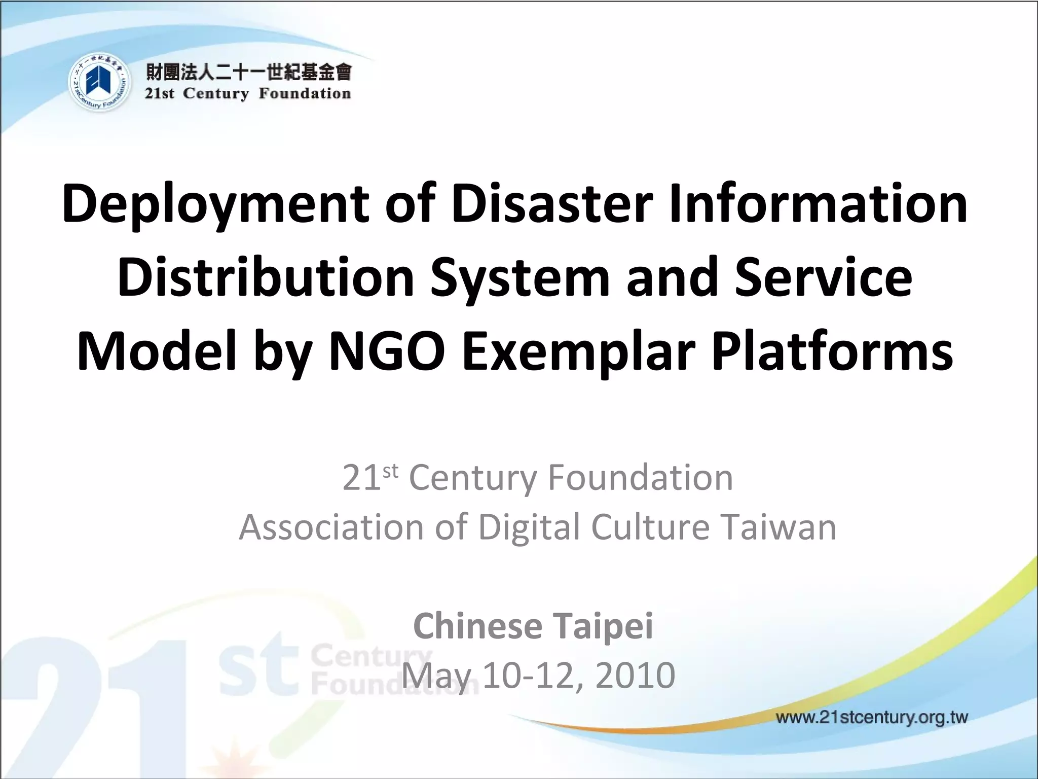 The document outlines the deployment of a disaster information distribution system and service model by the NGO, Exemplary Platforms, in response to the devastating Typhoon Morakot in Taiwan. It highlights the importance of NGOs in bridging the information gap between governments and citizens during disasters, emphasizing the need for real-time information sharing and collaboration between civil organizations and emergency operation centers. The project aims to develop a multilingual platform that utilizes cloud-computing and social media to enhance disaster response and improve transparency and efficiency in crisis situations.