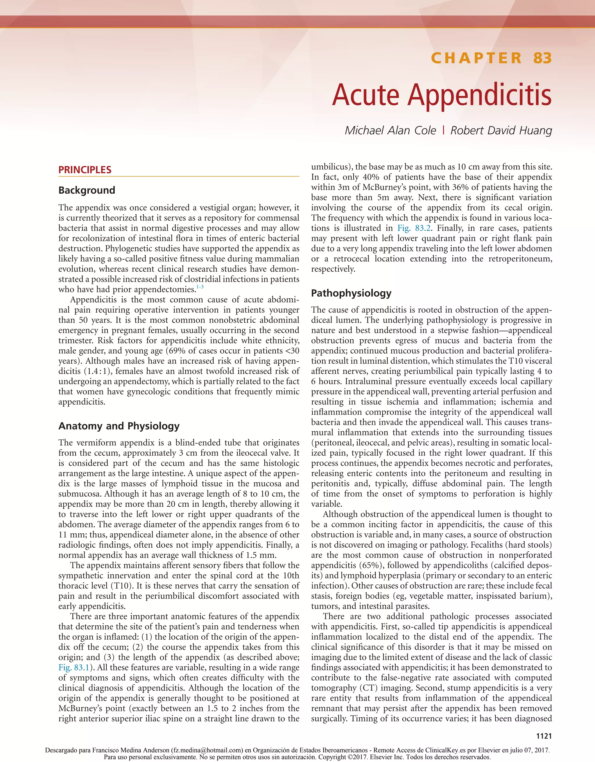 This document provides background information and summarizes key principles regarding acute appendicitis. It begins by discussing the appendix's role in the digestive system and risk factors for appendicitis. The anatomy and pathophysiology of appendicitis are then described, noting that obstruction of the appendix is the underlying cause. Common presenting symptoms are reviewed, emphasizing that the classic presentation is seen in less than 50% of cases, making diagnosis challenging. Differential diagnoses and the role of laboratory tests, imaging, and clinical assessment in evaluation are also summarized. Throughout, it is stressed that diagnosis relies on integrating multiple factors rather than any single finding.