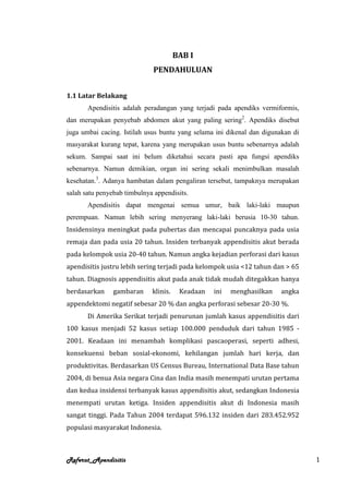 Apendisitis adalah peradangan pada apendiks yang disebabkan oleh hambatan aliran lendir di dalamnya, yang dapat menyebabkan infeksi bakteri. Apendiks berada di ujung sekum dengan vaskularisasi dari arteri apendikularis. Gejala apendisitis tergantung lokasi apendiks dan umumnya berupa nyeri di perut bagian bawah kanan. Diagnosis didukung dengan pemerikahan darah dan gambaran klinis, sementara CT scan