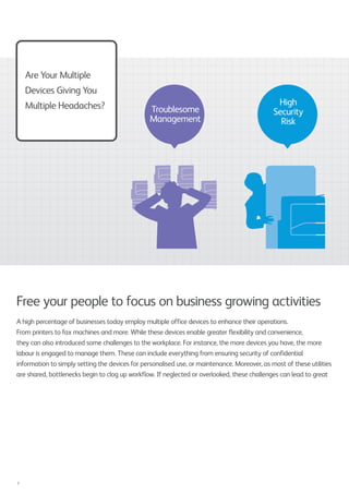 The ApeosWare Management Suite (AWMS) is an integrated software solution designed for businesses to efficiently manage multiple office devices, enhancing productivity while reducing costs and environmental impact. It includes five modules that facilitate device management, user authentication, log management, print management, and document flow management, allowing centralized control and streamlined processes. By employing features like automated reporting, user restrictions, and efficient authentication methods, AWMS addresses common challenges associated with device management in contemporary workplaces.