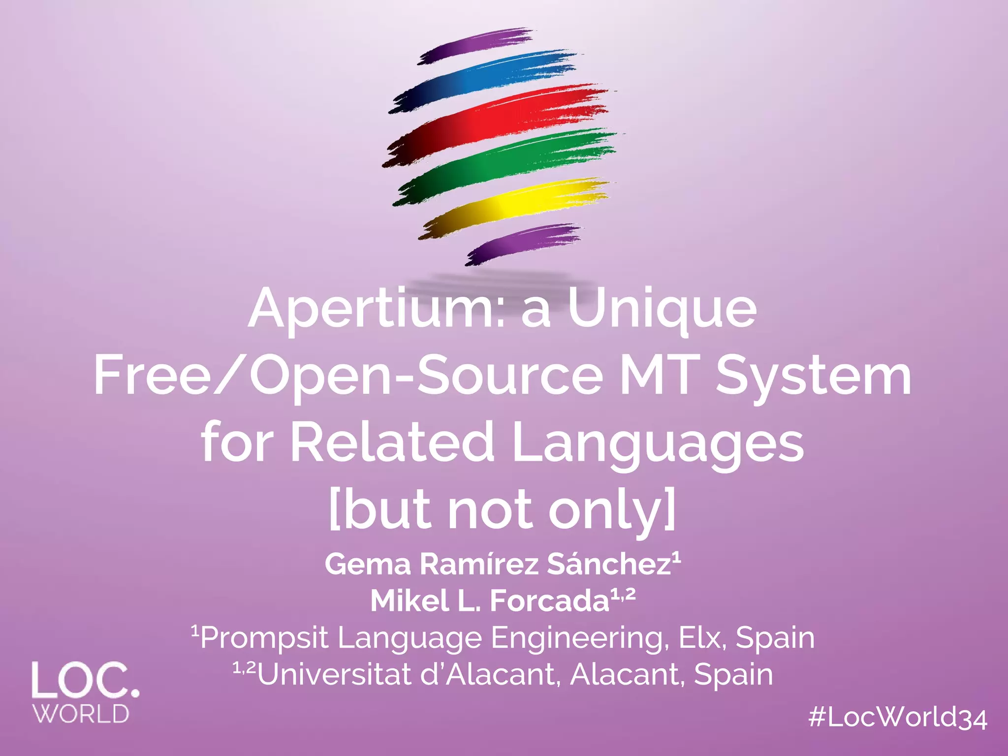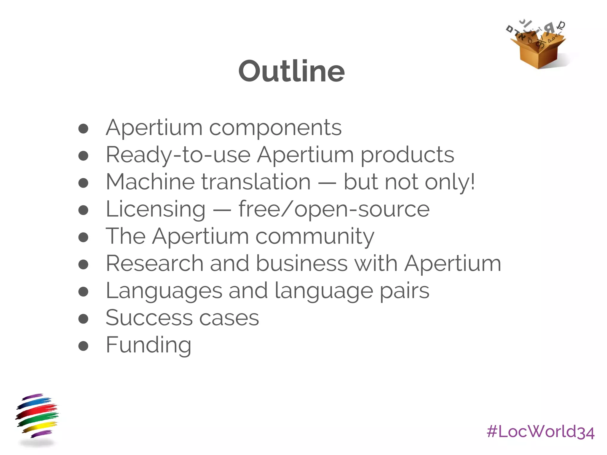 The document provides an overview of Apertium, an open-source machine translation system. It describes Apertium's main components, including its engine, data in XML formats, and tools. It also discusses Apertium's ready-to-use products, licensing as free/open-source, active community of hundreds of developers, research uses, over 40 supported language pairs including smaller languages, and some success stories in localization.