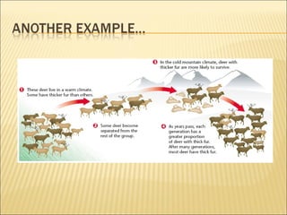 The document summarizes the process of evolution on Earth over the past 4 billion years. It describes how chemical evolution led to the formation of organic molecules and early life forms like single-celled bacteria over 1 billion years. Biological evolution then produced the diversity of plant and animal species we see today through natural selection and adaptation over the past 3.7 billion years. Key figures like Charles Darwin contributed to the understanding of evolution by natural selection, where traits that aid survival and reproduction are preserved and passed on.