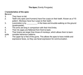 1. The document describes the anatomical characteristics of apes and compares them to humans.