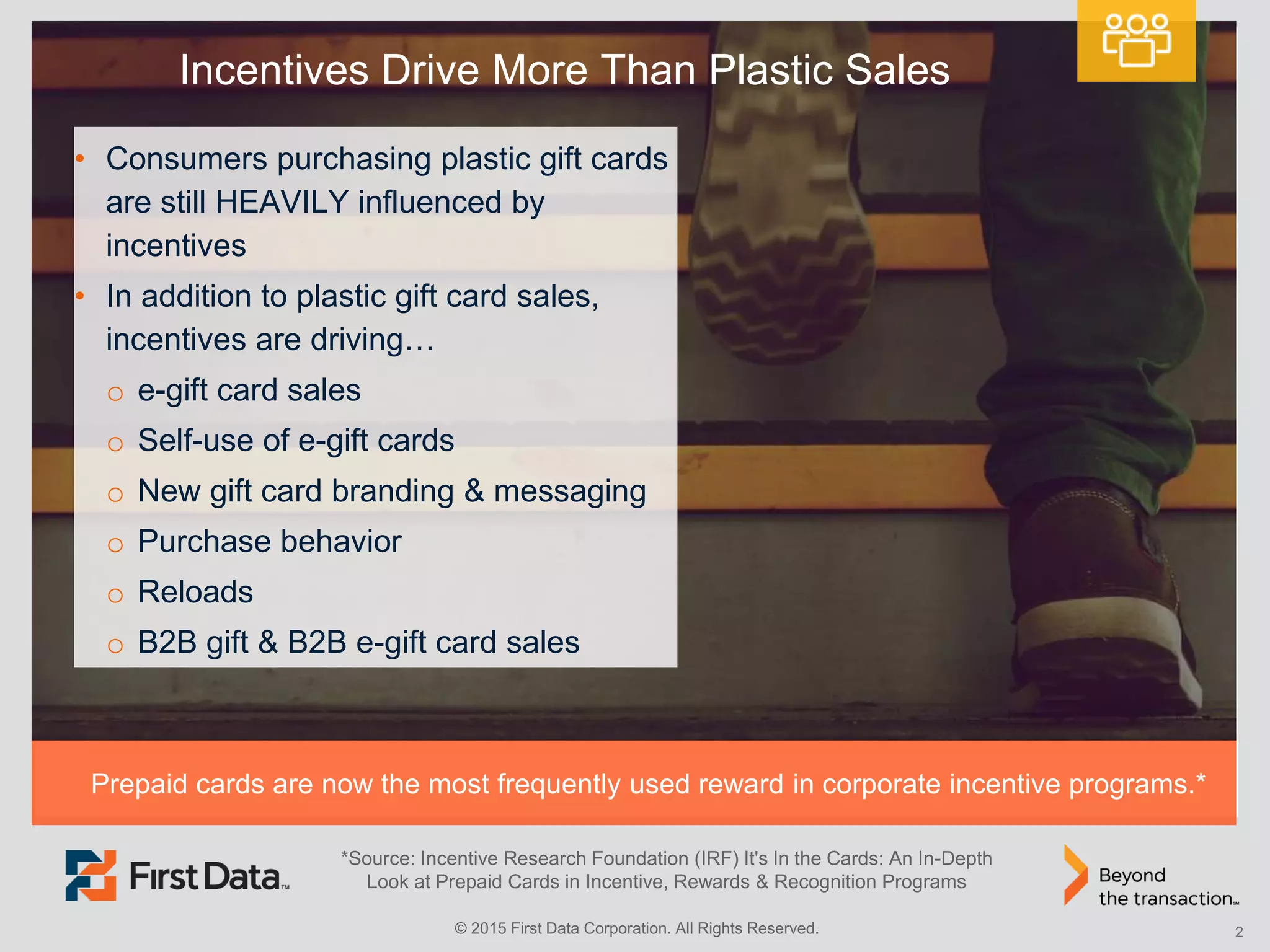 The document discusses the growing influence of prepaid gift cards and incentives on consumer purchasing behavior and the B2B gift card market. It highlights findings from First Data's annual prepaid consumer insights study, which measures trends in gift card purchases and reloading. The report also emphasizes the effectiveness of incentives in driving sales and customer engagement in both consumer and corporate settings.