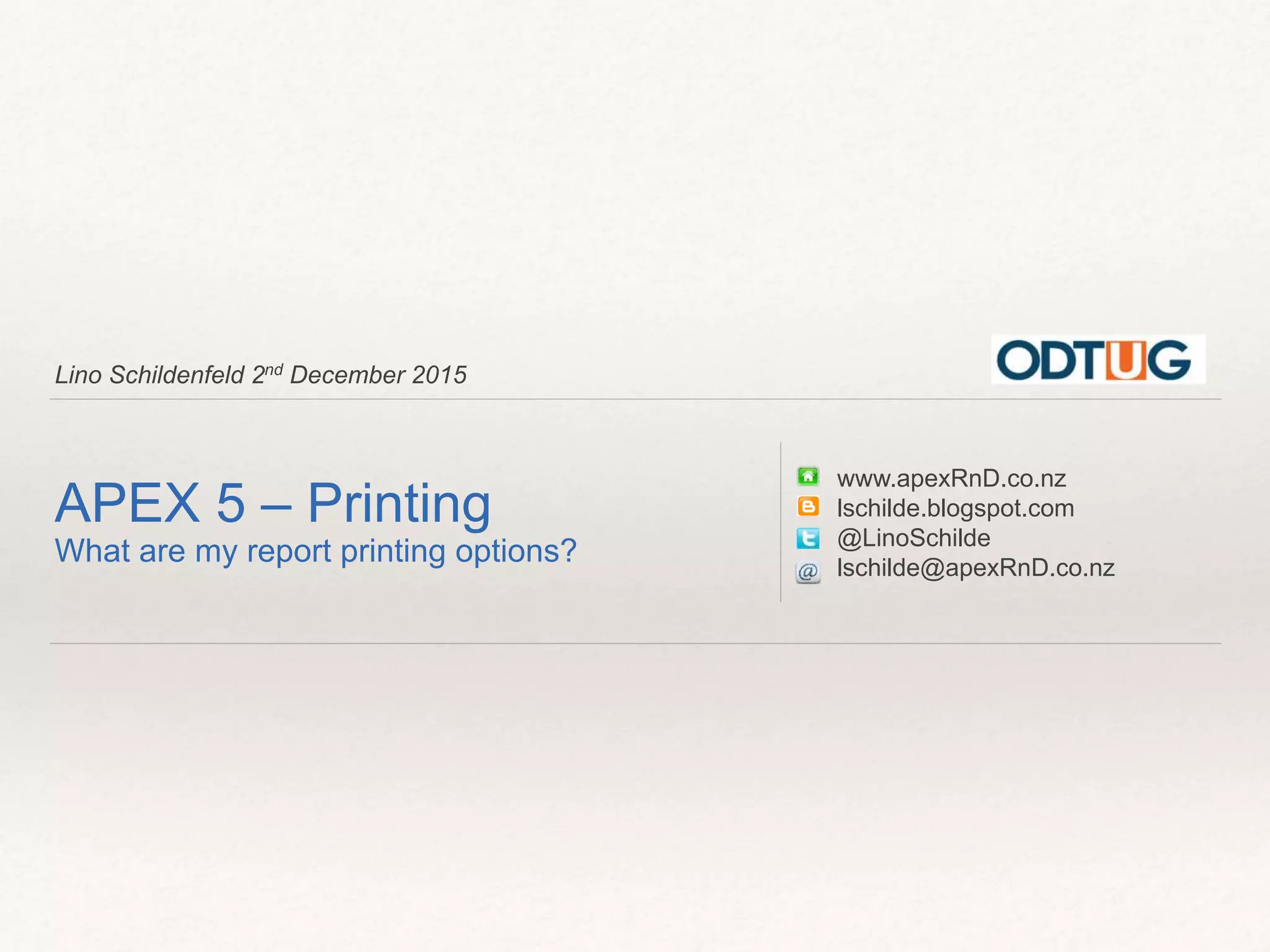 The document discusses various options for printing reports from Oracle Application Express (APEX), including using APEX's built-in reporting and printing capabilities, third-party plugins like Reports 2 PDF, and standalone reporting tools like Jasper Reports, PL/PDF, Doxxy, and BI Publisher. It provides an overview of each option's features, installation, usage, and suitability for different use cases. The document demonstrates ApexOfficePrint as a full-featured reporting solution that can generate PDFs, Office files, and offer printing as a service using templates created in Word, Excel and PowerPoint.