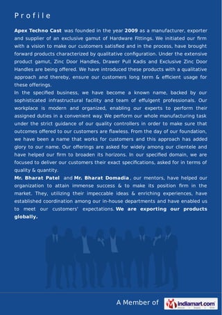 Apex Techno Cast is a manufacturer and supplier of hardware fittings like zinc door handles, drawer pull kadis, and door knobs established in 2009. They have a large product line and employ 11-25 people. Their competitive advantage is their extensive range of designer, fancy, and modular zinc door handles, drawer pulls, and other hardware fittings used in homes, offices, and commercial establishments.