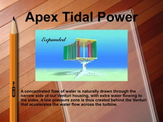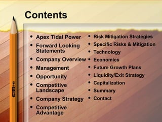Apex Tidal Power presents patented technology aimed at capturing tidal energy with efficiency three times higher than competitors, potentially generating significant profits through power purchase agreements in the UK. The company has a comprehensive strategy for managing risks and ensuring economic viability, including plans for scalable deployment and a robust support team with extensive experience in offshore energy. Future growth targets include a significant increase in energy capacity over the next five years, promising substantial returns to investors.