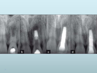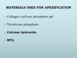 This document discusses apexification and indirect pulp capping procedures. Apexification is used to induce calcification at the open apex of an immature tooth to allow for root canal treatment. Materials used include calcium hydroxide, tricalcium phosphate, and MTA. Calcium hydroxide is placed in the canal and replaced every 3 months until radiographic evidence of apical barrier formation. MTA can also be used by placing it at the apex. Indirect pulp capping covers the deepest carious dentin with a biocompatible material like calcium hydroxide to prevent pulpal exposure while removing infected dentin, allowing for pulp preservation.