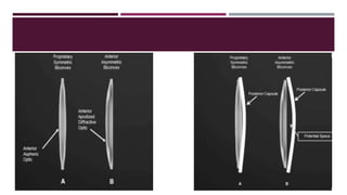 This document discusses different types of intraocular lenses (IOLs) used in cataract surgery. It covers various factors that influence IOL choice such as material, design, and patient needs. The main materials discussed are polymethylmethacrylate, hydrophobic acrylic, hydrophilic acrylic, and silicone. IOL designs include multifocal, toric, and aspherical lenses. Special considerations are mentioned for choosing IOLs in cases of incomplete capsule support, high myopia, or uveitis. The document provides details on characteristics and indications for different IOL materials and designs.