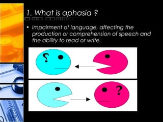 Aphasia is a language impairment caused by brain damage, affecting speech production and comprehension, which can result from injury, stroke, or progressive conditions like dementia. It is classified into expressive aphasia (Broca's) and receptive aphasia (Wernicke's), each with distinct symptoms and diagnostic methods. Treatment typically involves therapy to enhance language abilities and can vary based on individual needs, with some patients recovering without intervention.