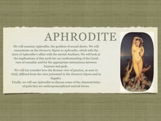 This document discusses Aphrodite, the Greek goddess of sexual desire. It examines her portrayal in the Homeric Hymn to Aphrodite, which tells of her affair with the mortal Anchises. This relationship highlights Greek views of appropriate interactions between gods and humans, as well as gender roles. The hymn also depicts Aphrodite as an external force imposing sexual passion. Later authors, like Ovid, presented passion in a more emotionally significant way, though Aphrodite remained a capricious goddess rather than one of devoted love. She exemplifies gods as personifications of natural forces that cannot show compassion.