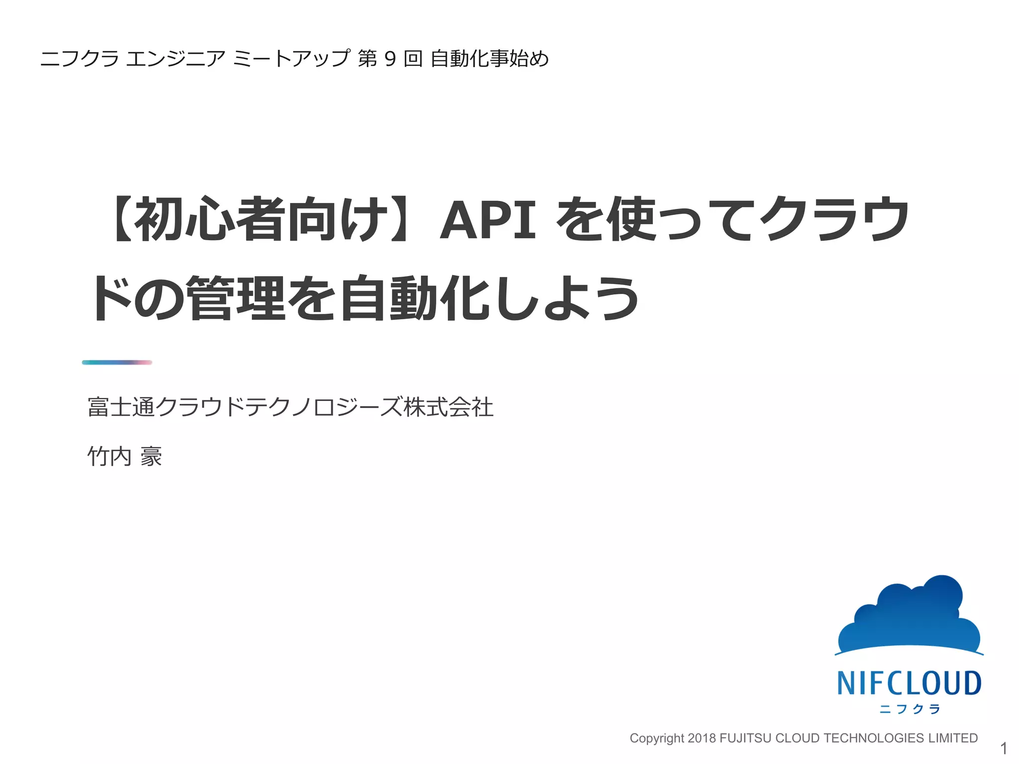 CLOUD TECHNOLOGIES LIMITED 【初心者向け】API を使ってクラウ ドの管理を自動化しよう 富士通クラウドテクノロジーズ株式会社 竹内 豪 1 ニフクラ エンジニア ミートアップ 第 9 回 自動化事始め