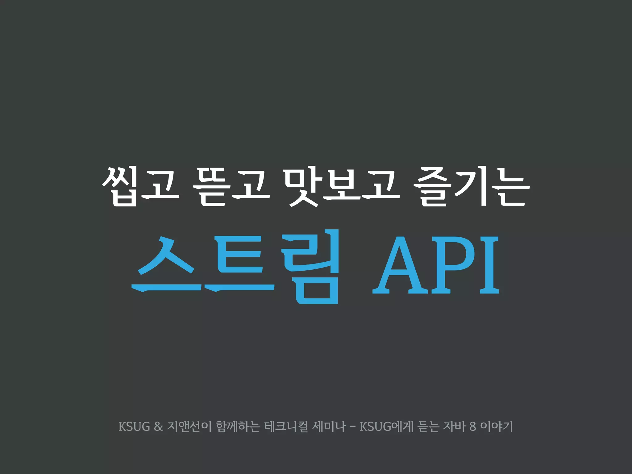 스트림 API를 통해서 자바에서도 맵/리듀스 방식으로 대량의 데이터를 순차 또는 병렬 처리를 할 수 있게 되었는데요, 이번 발표를 통해 스트림 API가 무엇인지- 어떻게 써먹는지에 대해 가볍게 씹고 뜯고 맛보고 즐기셨으면 좋겠습니다. :)