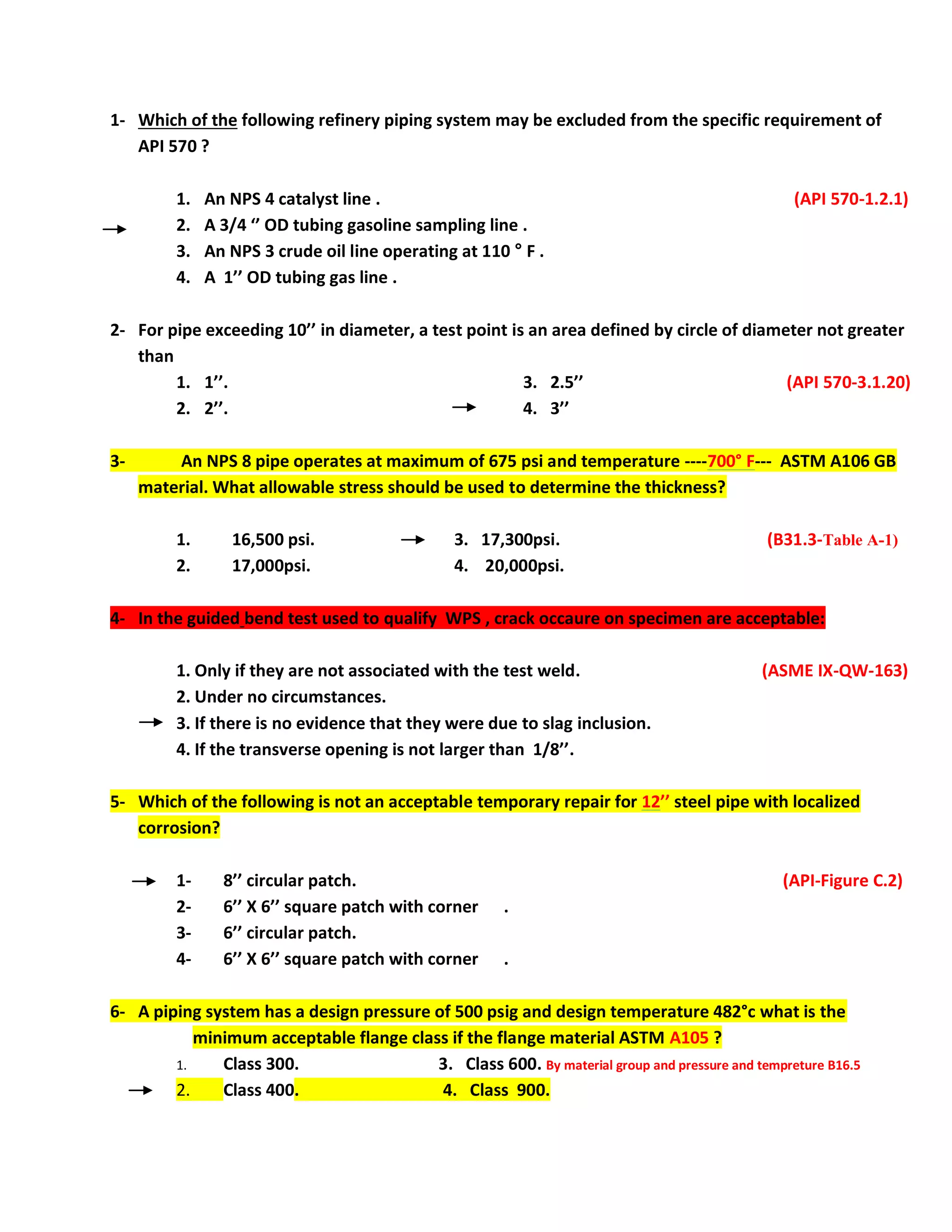2. The questions cover topics like allowable stresses, corrosion rates, NDE methods, weld quality, coating inspection, and piping material selection.