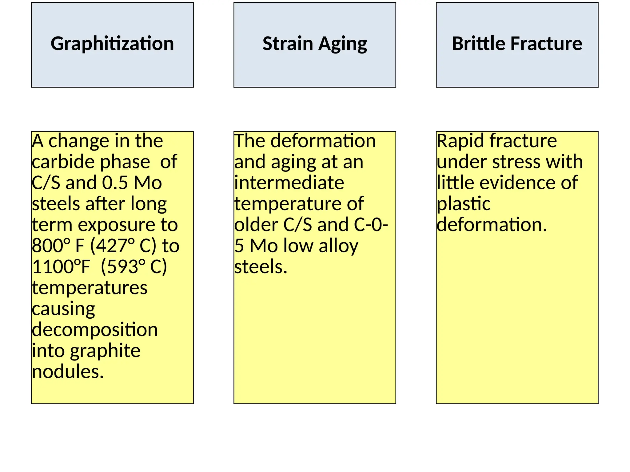 The document outlines various damage mechanisms that affect mechanical and metallurgical components, highlighting phenomena such as graphitization, brittle fracture, and corrosion in different environments. It details temperature-related failures, the effects of stress, and specific corrosive agents leading to material degradation. The mechanisms discussed are critical for understanding and preventing equipment failures in industrial settings.