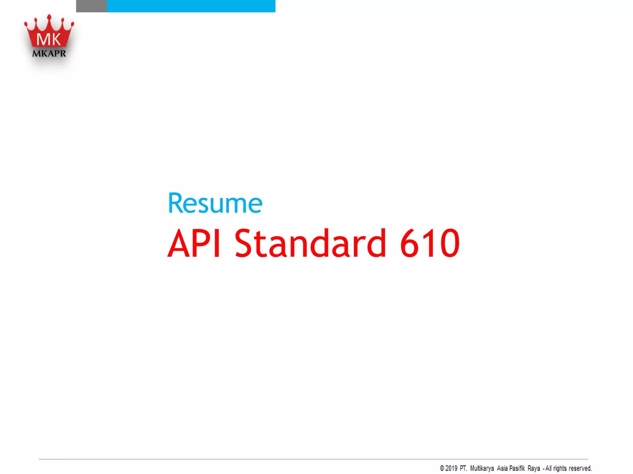 Dokumen ini membahas standard API 610 yang ditetapkan oleh American Petroleum Institute untuk pompa centrifugal dalam industri migas dan petrochemical. Standar ini bertujuan untuk memudahkan engineer dalam membuat spesifikasi peralatan dan memastikan kesamaan spesifikasi dalam pengadaan pompa. Terdapat berbagai jenis pompa yang di klasifikasikan sesuai dengan spesifikasi dan persyaratan API 610, termasuk tipe OH, BB, dan VS.