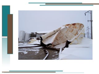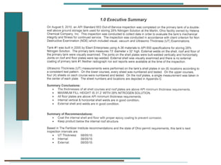 The document provides information about API 653 tank inspections, tank maintenance, and causes of tank failure. It discusses why tanks should be inspected, proper inspection protocols including inspector credentials, common inspection procedures, and providing calculations. It also discusses a common sense approach to tank maintenance and inspections. Finally, it outlines common causes of catastrophic tank failure such as improper welding procedures, lack of inspections, corrosion, and overfilling tanks.