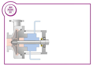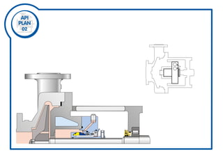 This document discusses API piping plans for mechanical seal flushing arrangements. It provides descriptions and guidelines for 15 standardized API plans that are widely used in industry to circulate fluid for seal cooling and lubrication. The plans involve arrangements like internal and external recirculation lines, strainers, flow control orifices, heat exchangers, and dual seal barrier fluid systems. Caution is given about design considerations like pressure differentials, flow rates, and fluid compatibility for each plan.