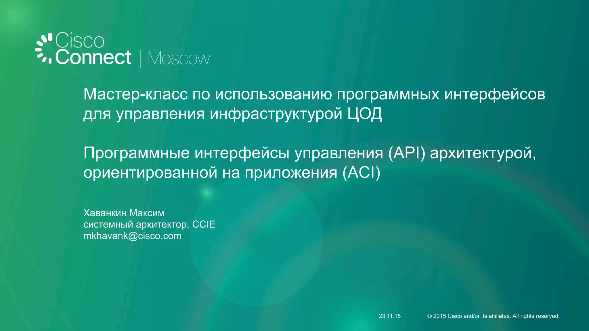 Документ описывает мастер-класс по использованию программных интерфейсов (API) для управления инфраструктурой центров обработки данных (ЦОД) с акцентом на архитектуру, ориентированную на приложения (ACI). Рассматриваются различные аспекты работы с REST API, включая объектную модель ACI, использование Cobra SDK, а также создание и управление объектами в ACI с помощью API. Документ также содержит примеры запросов и описания методов работы с данными через API.