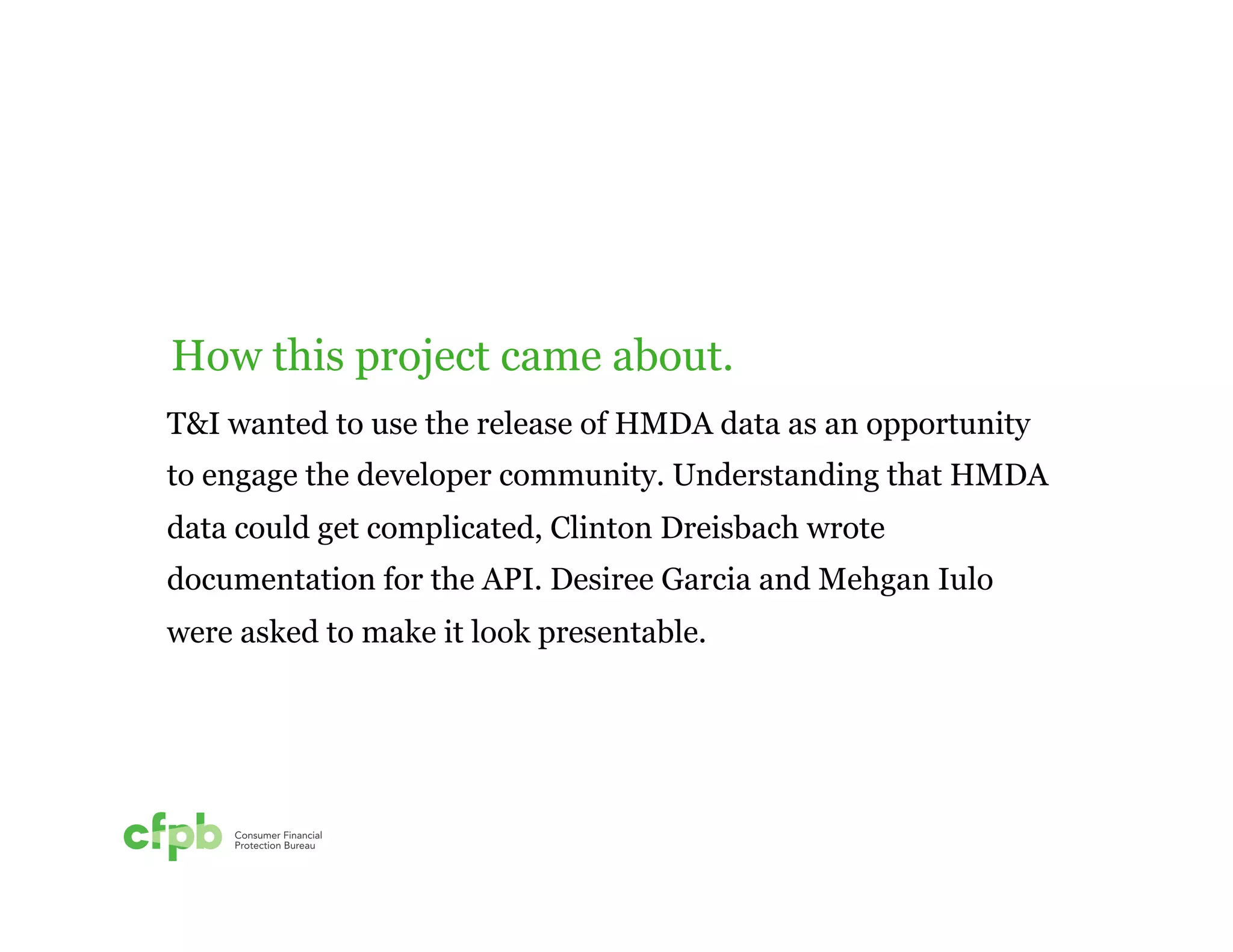 The document discusses efforts to improve the usability of API documentation for the HMDA (Home Mortgage Disclosure Act) data through user research and addressing issues on GitHub. It describes how user testing found the documentation intuitive but also identified areas to improve like adding examples, trimming unnecessary legal language, and fixing interactive elements that were crashing. It emphasizes the importance of ongoing responsiveness to user feedback on GitHub to maintain motivation for developers to contribute. Lessons learned include treating developers as users, recognizing that mortgage data may not be inherently interesting, and experiencing the documentation firsthand to better understand users' perspectives.