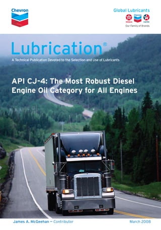 The document discusses the introduction of the new API CJ-4 diesel engine oil category. It was developed in response to new EPA emissions standards requiring diesel particulate filters (DPFs) on all on-highway diesel engines in the U.S. as of 2007. The API CJ-4 category includes limits on sulfated ash, phosphorus, and sulfur to ensure compatibility with DPFs and adequate engine durability when using ultra-low sulfur diesel fuel. The category consists of nine engine tests and six bench tests, making it the most robust API category developed. The document reviews the development and requirements of the API CJ-4 category.