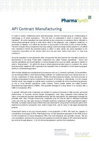 In order to clearly understand active pharmaceuticals contract manufacturing an understanding of terminology is of prime importance. The first term to understand is what is meant by "active ingredient". PharmaSynth has the capacity to manufacturer most types of APIs. Visit: http://www.pharmasynth.com.au/