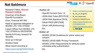 Nat Sakimura presents on the OpenID Foundation's Financial API Working Group. The group aims to develop standards for financial APIs that allow applications to access user financial data and interact with accounts, while giving users control over privacy and security. The standards will be developed openly under OpenID Foundation's IPR policies. The work will build on existing standards like OAuth, JSON, and OpenID Connect. The group has made progress defining a multi-part standard, starting with read-only APIs, and hopes to eventually submit standards to ISO for broader adoption. Sakimura invites attendees to join and contribute to the working group.