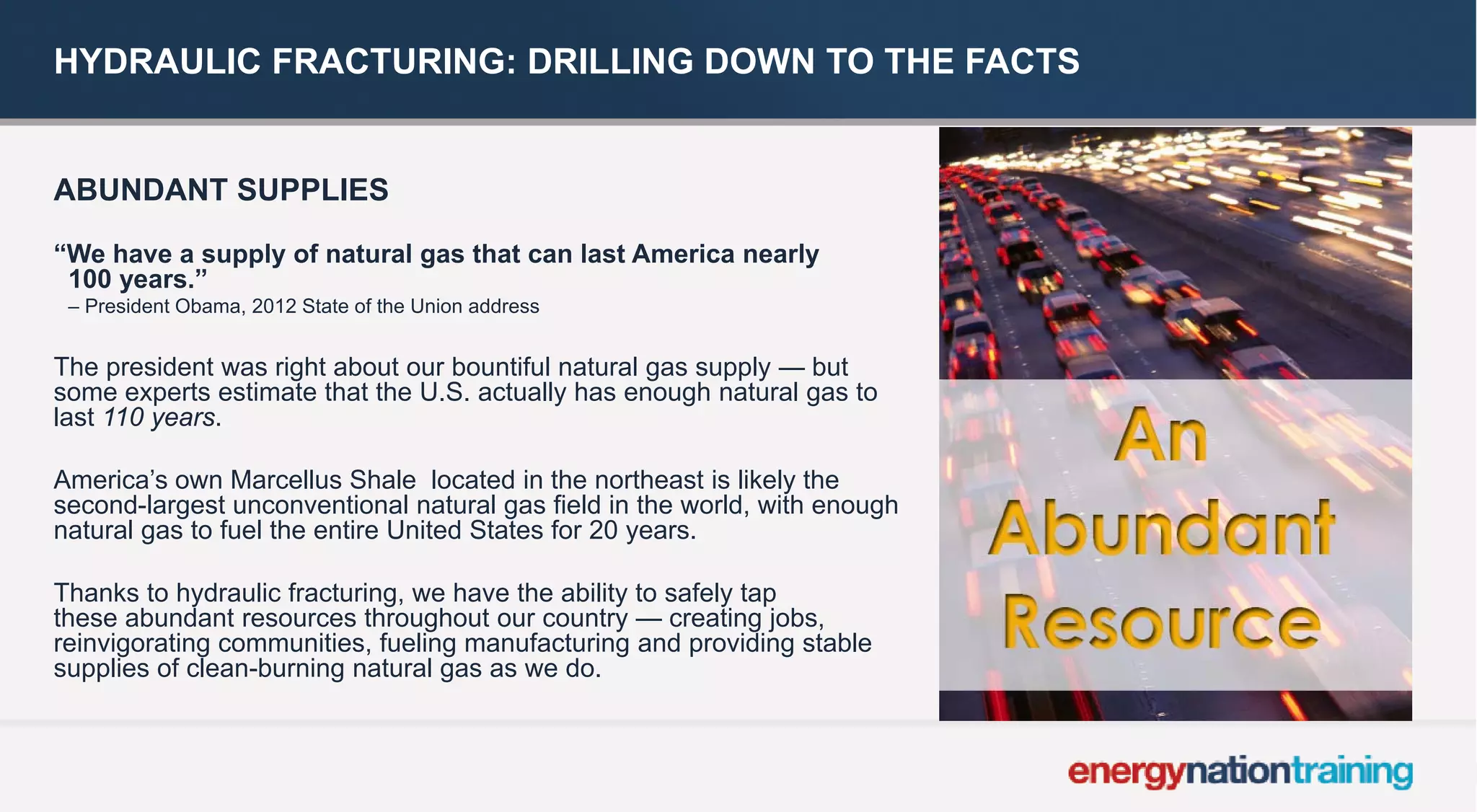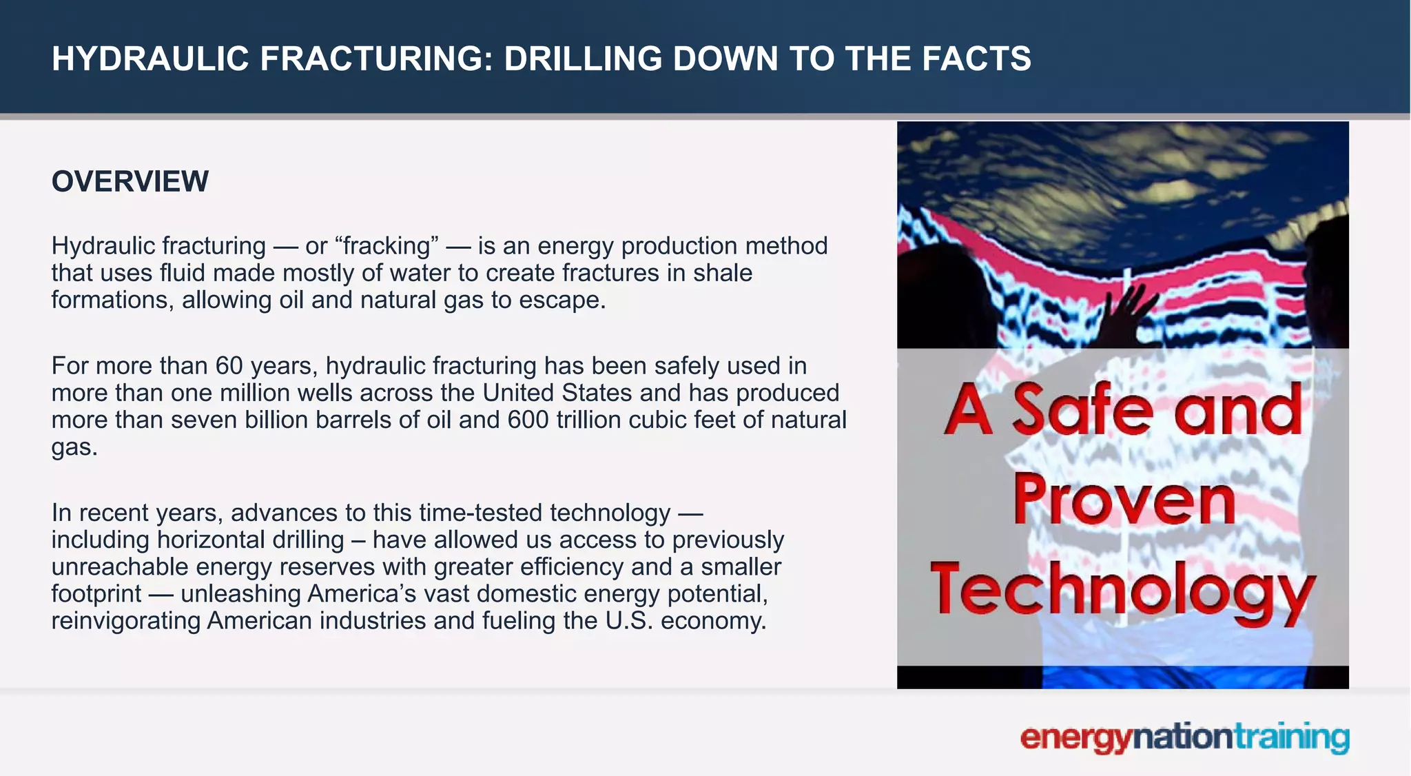 Hydraulic fracturing, also known as fracking, is a process that has been used safely for over 60 years to extract oil and natural gas from shale formations by creating fractures in the rock. It allows access to large reserves that can provide energy for decades and has contributed to economic growth through job creation and lower energy costs. While fracking occurs thousands of feet below water sources, regulations ensure protection of groundwater through redundant casing and primarily using water in the fracking process. Increased natural gas from fracking has also helped reduce US carbon emissions.