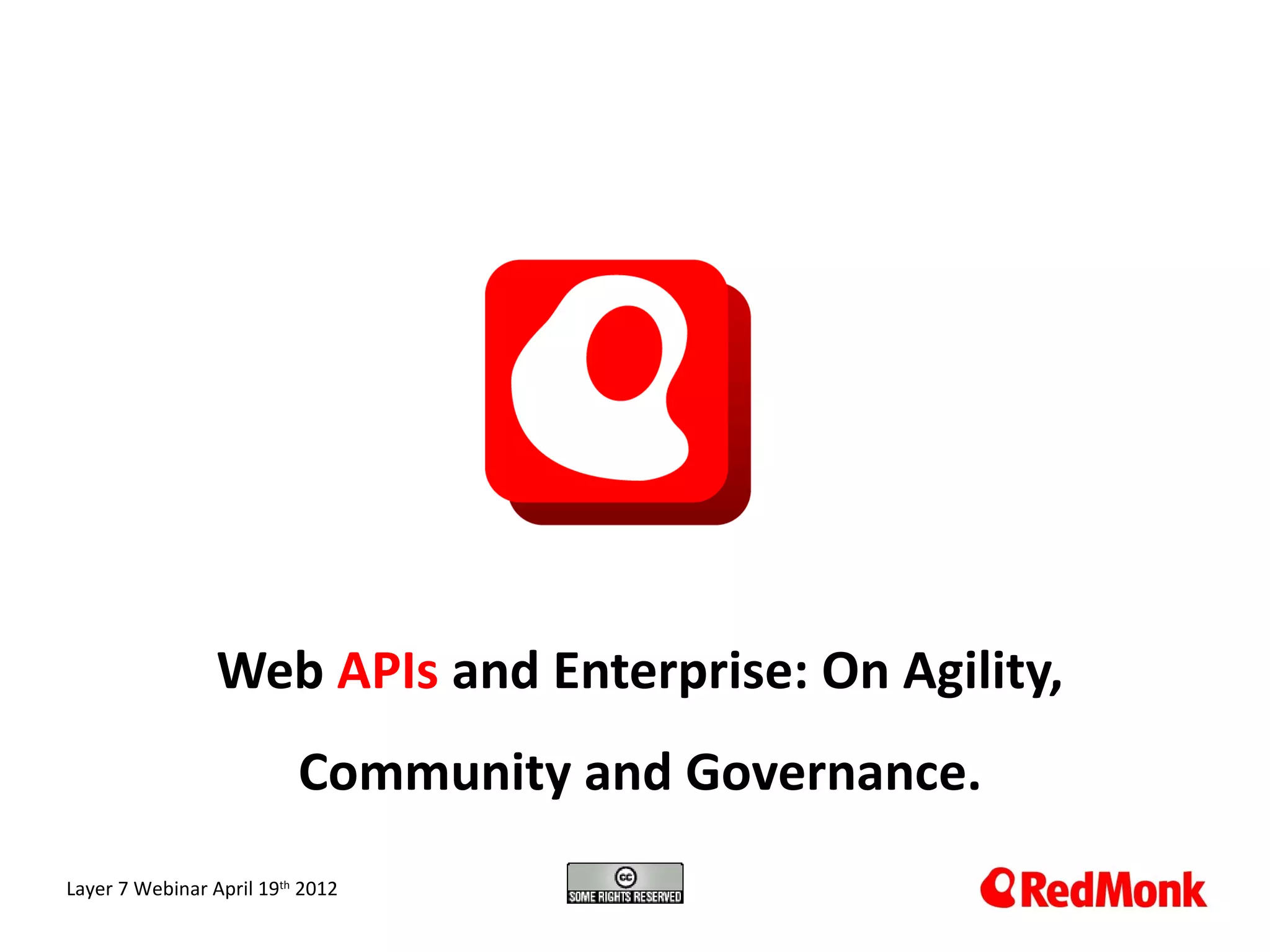 The document discusses the significance of web APIs in the context of the API economy, emphasizing community management and the importance of good API design for engagement and usability. It highlights the transformative potential of APIs as social tools and encourages organizations to view data as a valuable asset rather than a by-product. The document also touches on various aspects of API governance, quality, and the need for modular service design.