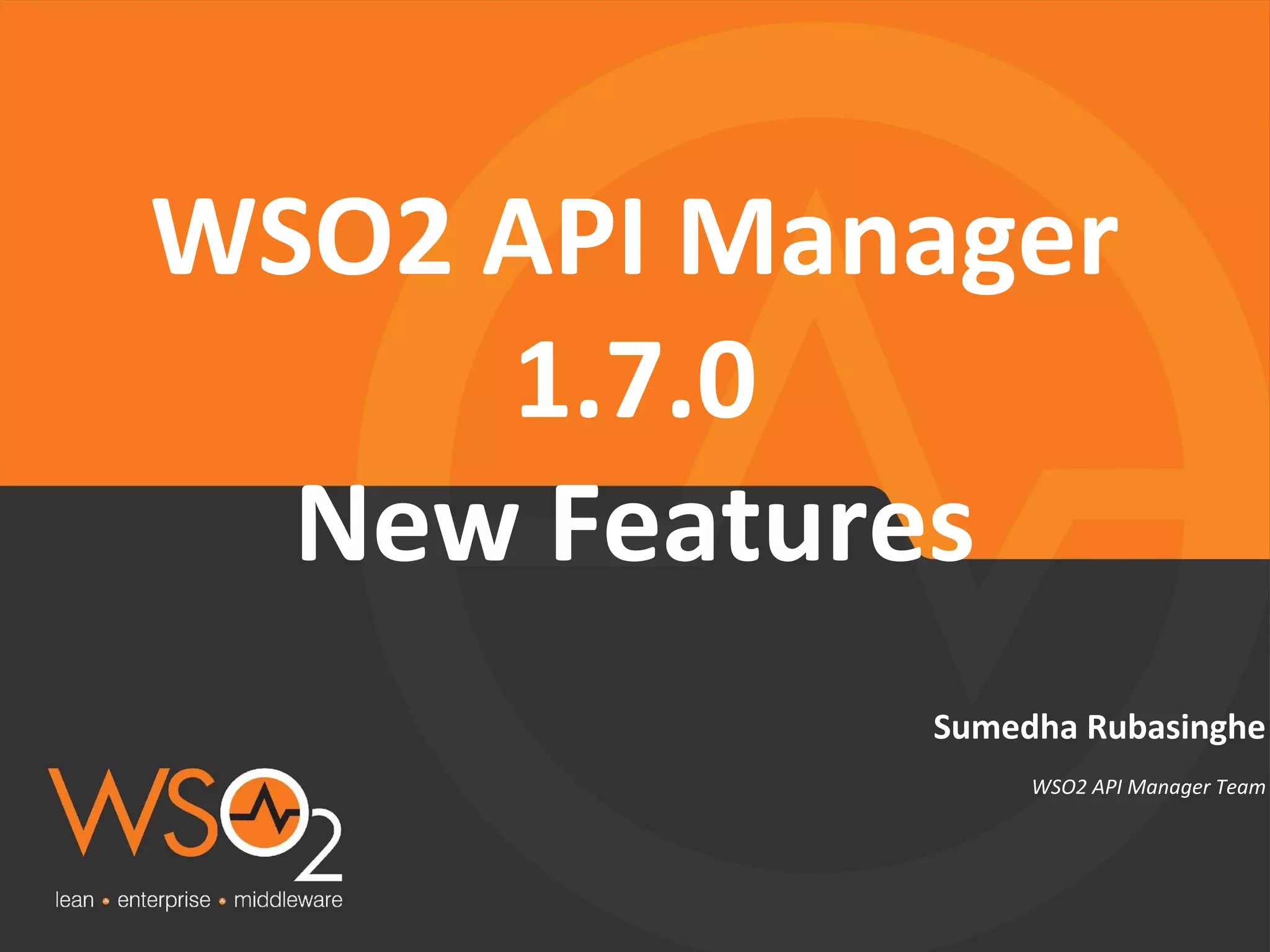 This document summarizes the key features of WSO2 API Manager 1.7.0. It discusses an API design wizard for designing, implementing, and managing APIs. It also mentions prototyped and published APIs, fine-grained authorization, API usage statistics, multi-tenant workflow support, customizable store themes, developer forums, documentation visibility filters, backend endpoint statistics, NTLM/OAuth integration, and reusable fault handling. The document promotes WSO2 API Manager and contacting WSO2 for additional information.