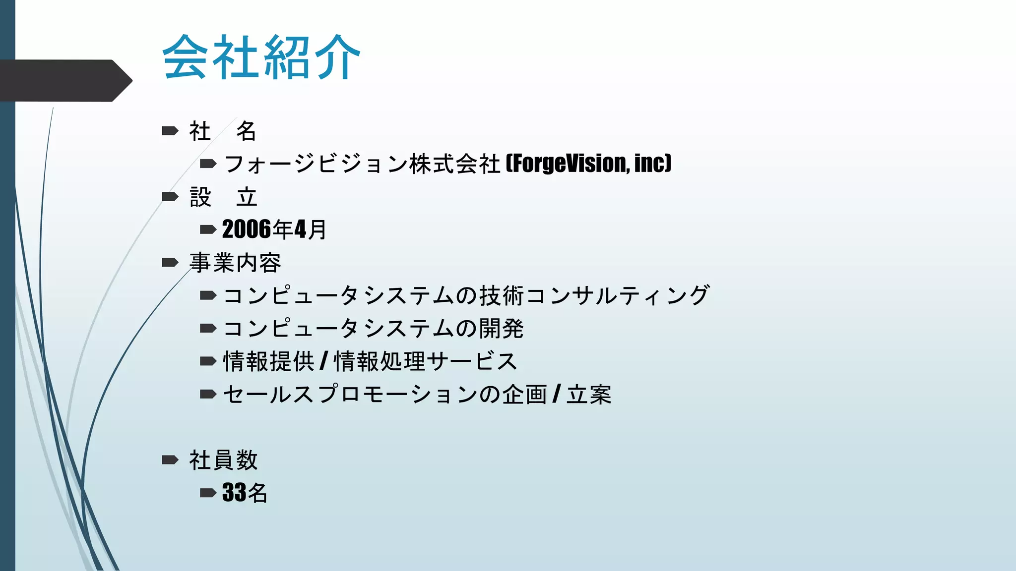 (ForgeVision, inc) 設 立 2006年4月 事業内容 コンピュータシステムの技術コンサルティング コンピュータシステムの開発 情報提供 / 情報処理サービス セールスプロモーションの企画 / 立案 社員数 33名