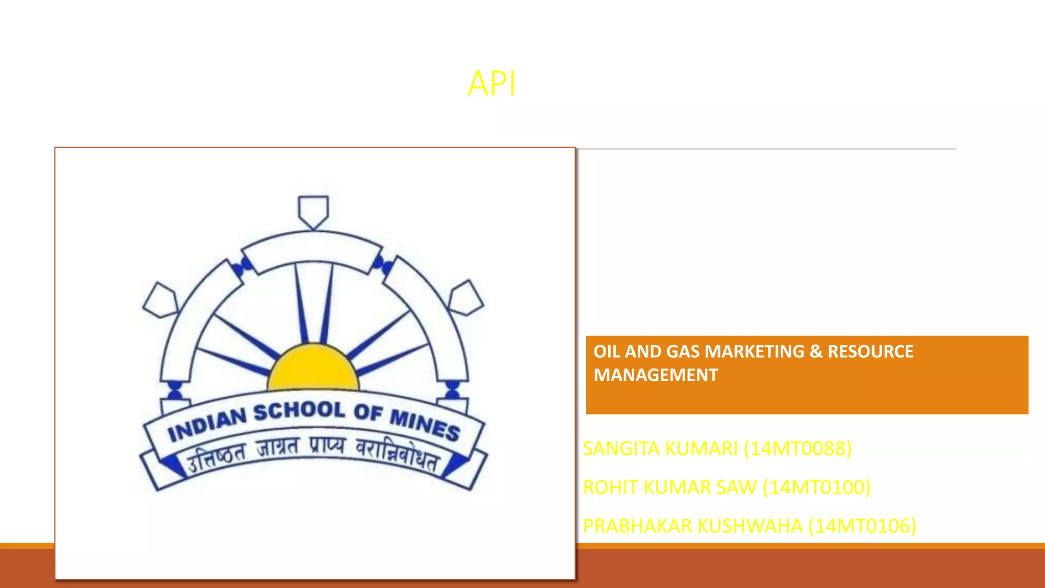 The American Petroleum Institute (API) is a U.S. trade association that represents the oil and gas industry. It develops standards for equipment and practices, conducts certification programs, and advocates on industry issues. API works in areas like exploration, transportation, refining, safety, health, and the environment. It publishes standards, recommended practices, and research to promote safety and efficiency. API also provides training courses and holds events to help members meet requirements and network.